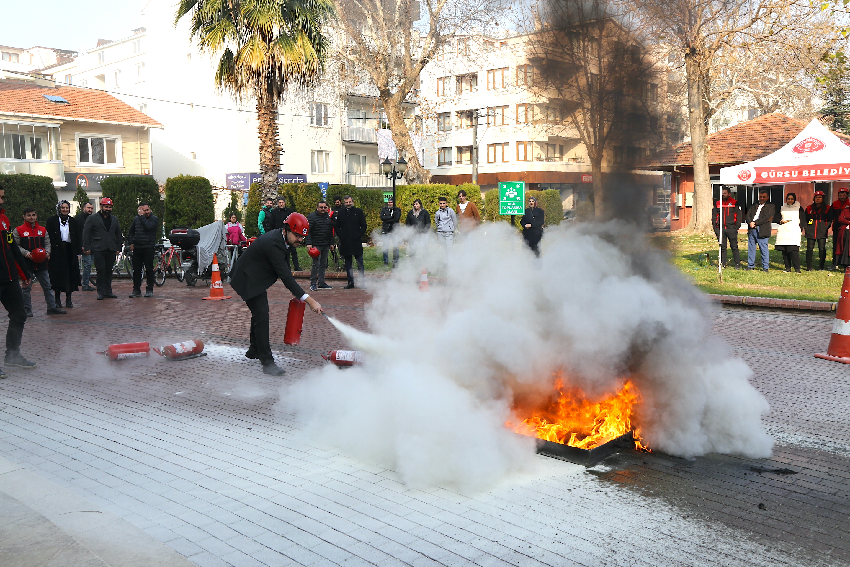Gürsu Belediyesi personellerinden ve gönüllülerden oluşan arama kurtarma ekibinin bilgilendirme ve yönlendirmeleriyle, deprem anında yapılması gerekenleri uygulamalı olarak gerçekleştiren Gürsu Belediye Başkanı Mustafa Işık ve belediye personeli, yangın söndürme konusunda da bilinçlendirildi.