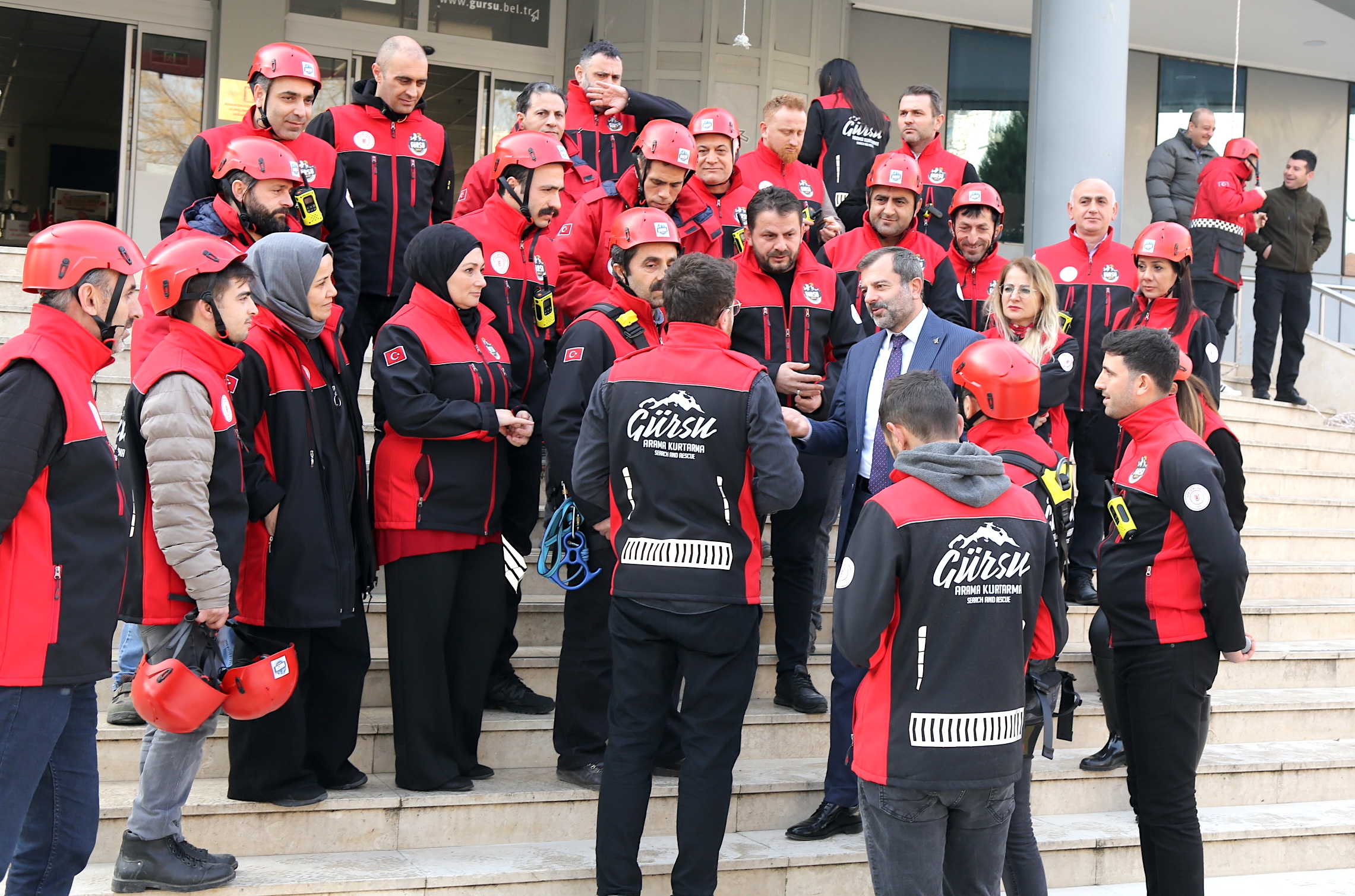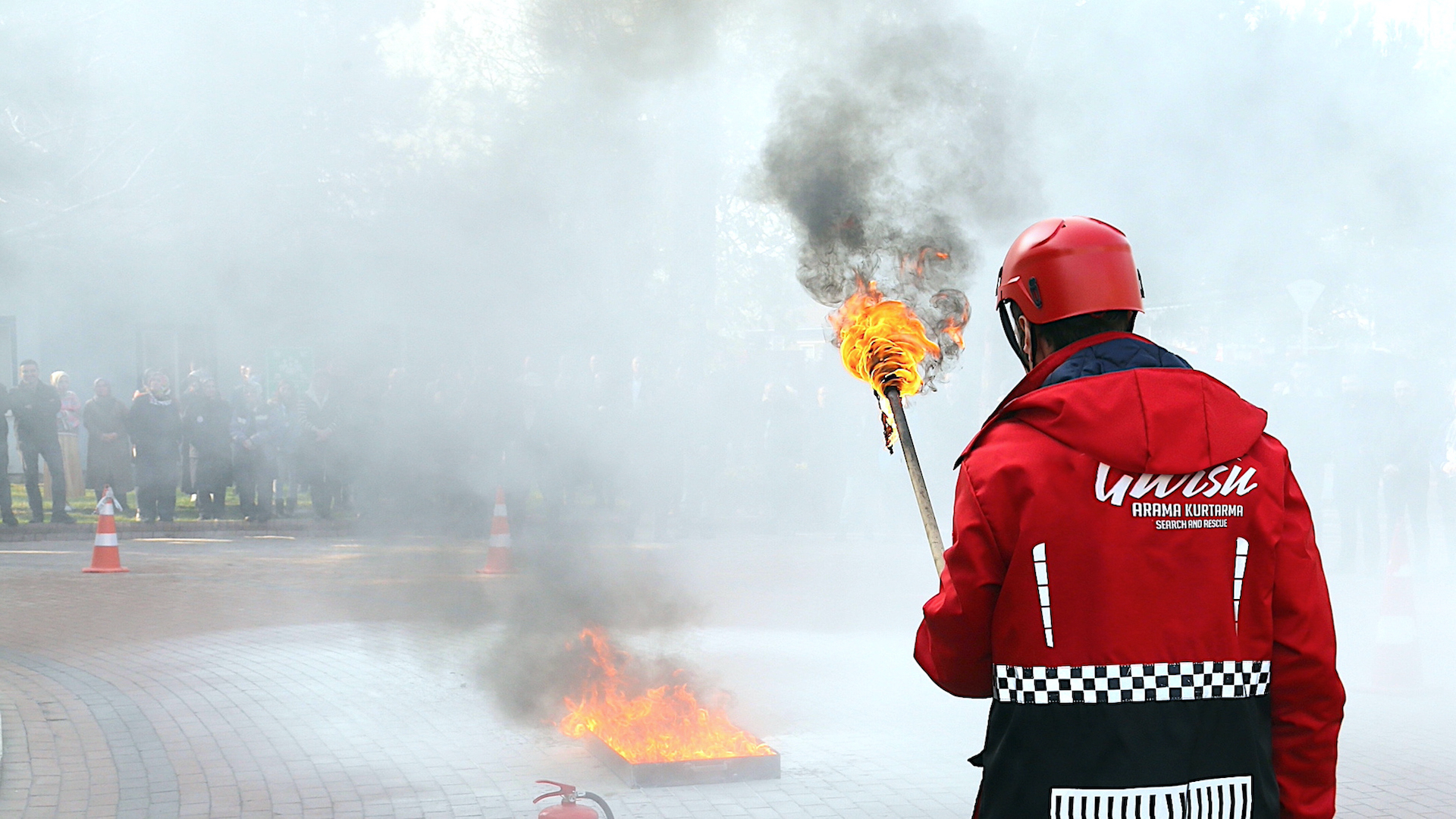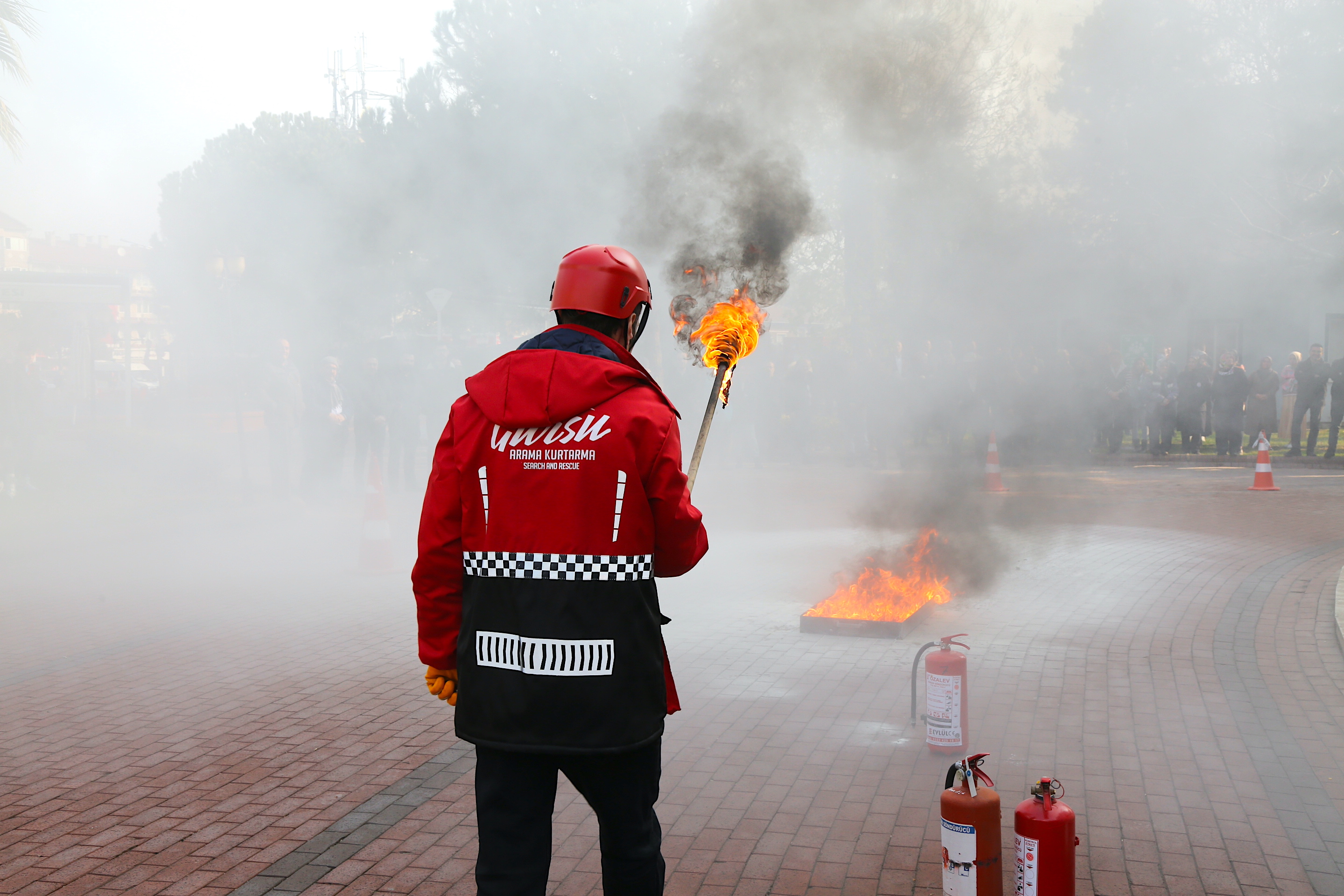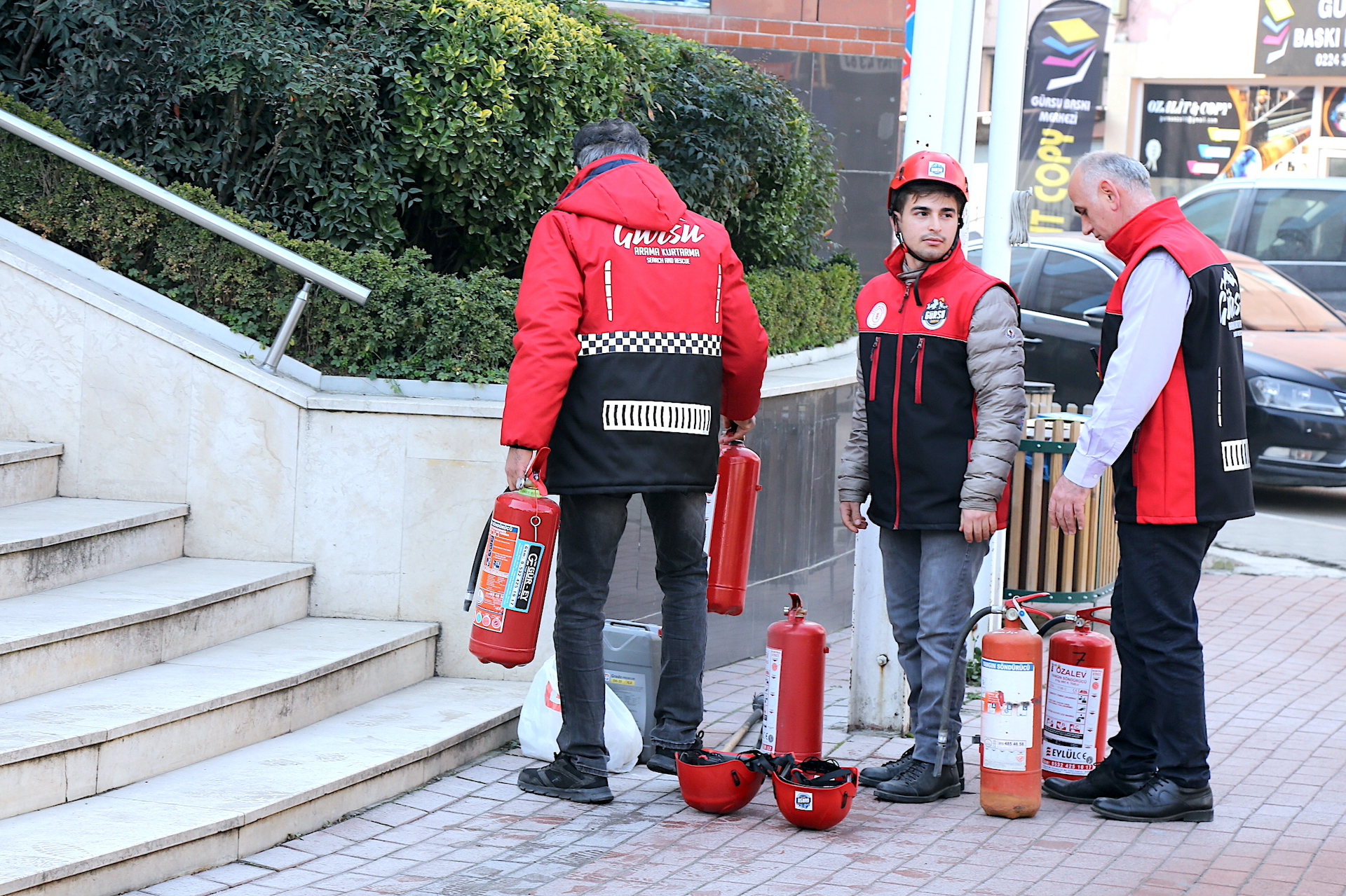 Gürsu Belediyesi personellerinden ve gönüllülerden oluşan arama kurtarma ekibinin bilgilendirme ve yönlendirmeleriyle, deprem anında yapılması gerekenleri uygulamalı olarak gerçekleştiren Gürsu Belediye Başkanı Mustafa Işık ve belediye personeli, yangın söndürme konusunda da bilinçlendirildi.